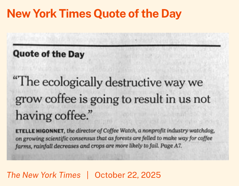 We spent an hour being uplifted by the optimism of Etelle Higonnet. She is the founder of Coffee Watch, a non-profit industry watchdog that just celebrated their one year anniversary.