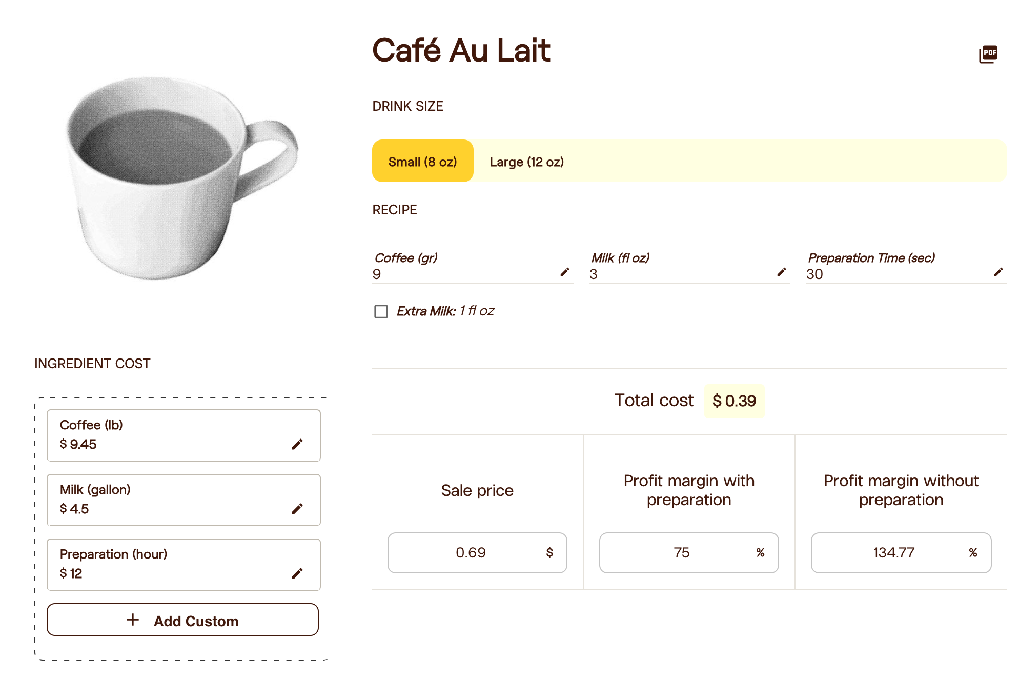 The ODEKO Drink Calculator is designed to help cafe’s determine the cost and margin of the drinks they’re pushing over the counter. The calculator offers a speedy resource accounting for base costs, labor, and additives multiplied by the desired margin.