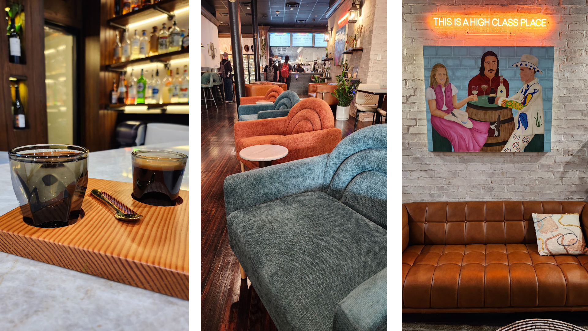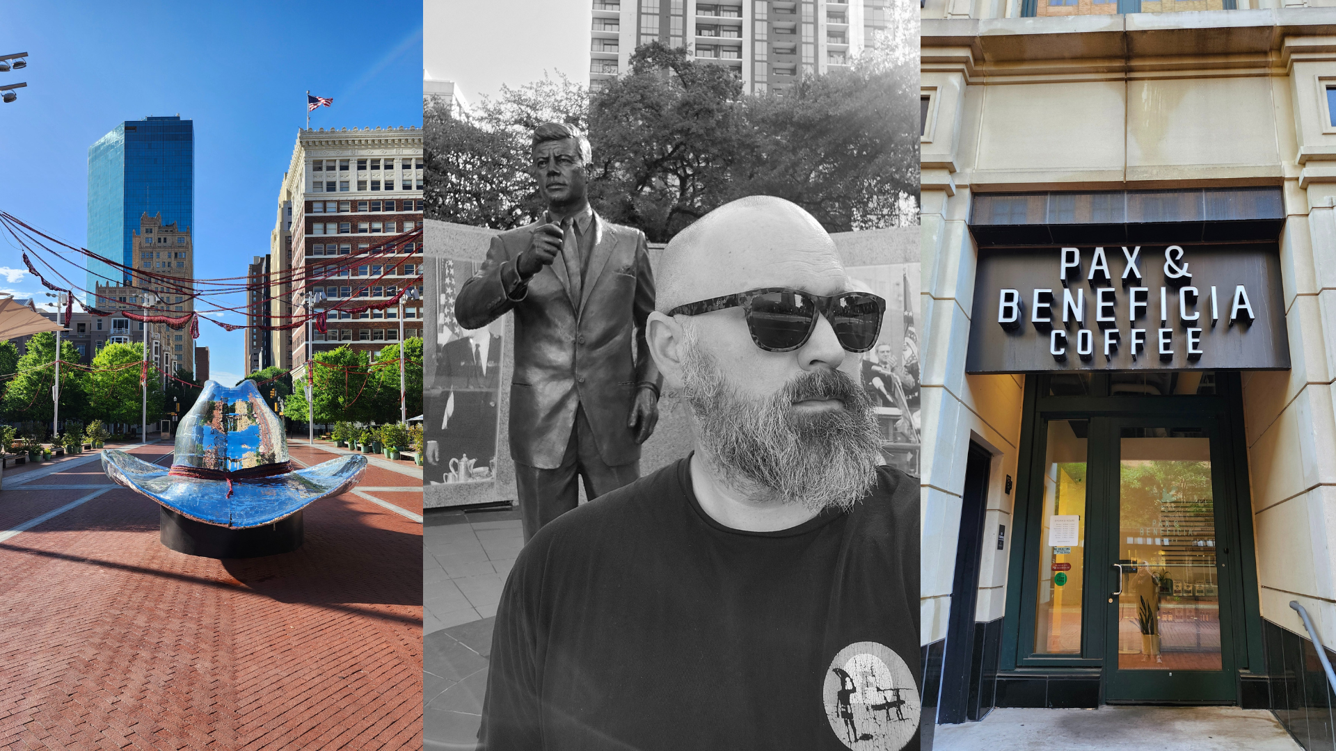 My first stop is at Pax & Beneficia for a shot of espresso, which is excellent. I take a photo with JFK, wander past a large cowboy hat statue in Sundance Square, and numerous historical plaques acknowledging the criminal past and proliferation of brothels that once occupied this space. I loop around the water gardens and stumble into The Hogan Alley. The vibe is Q-tip, cowboys, and chill. It’s a spot for coffee, beer, and wine. I love it. Michelle, Nina, and Lou offered up more than a bit of character making the shot of espresso even better. Time to get back on the road.